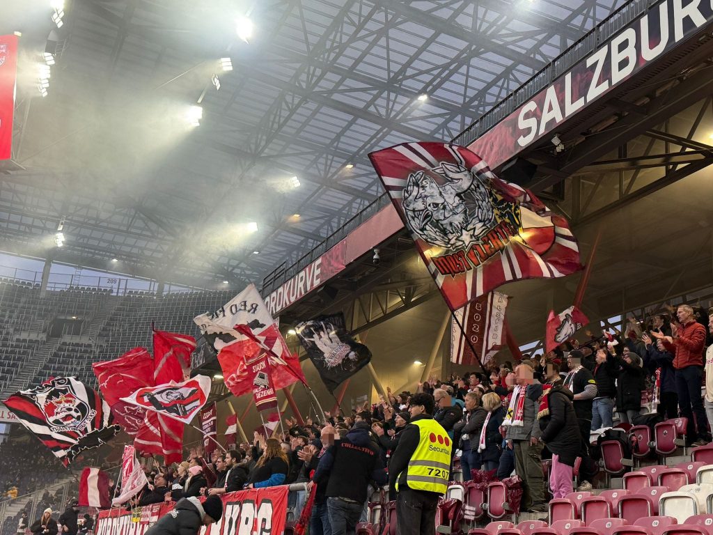 Rot, Weiß, Weinrot statt Schwarz. Eine bewusste Entscheidung, damit wir in der Nordkurve geschlossener und einheitlicher auftreten. Trotz des bitteren Matchverlaufs haben wir uns optisch gut gemacht.